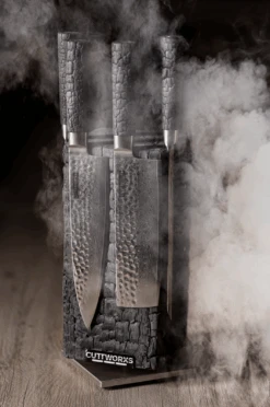 Cuttworxs Evolution koksmes is het meest gebruikte mes van elke chefkok en thuiskok maar dan in een zeer speciaal ontwerp. Het vlijmscherpe lemmet van dit mes springt in het oog door zijn bijzondere vormgeving. Het gehamerde lemmet, de fijne damaststructuren en tenslotte het met FlameWOOD® gepatenteerde handvat van gebrand hout maken dit mes uniek. Zoals alle Cuttworxs messen ligt het koksmes perfect in de hand en zorgt het voor de perfecte snede.