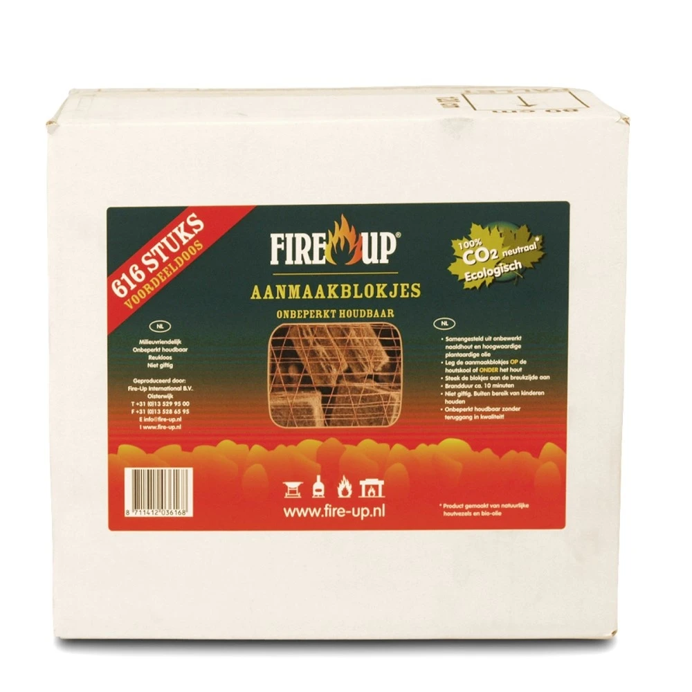 De milieuvriendelijke en bruine aanmaakblokjes van Fire-Up bestaan uitsluitend uit biologische materialen. Dit product bestaat uitsluitend uit plantaardige grondstoffen, aan de aanmaakblokjes zijn geen chemicaliën toegevoegd. Hierdoor zijn ze veilig aan te steken en geven zij geen smaak af aan het gerecht op de BBQ.Â