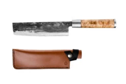 De wortelhouten handgreep oogt zeer luxe en is mooi afgewerkt. Het mes wordt geleverd in een luxe houten tray, inclusief een lederen messchede, om het mes veilig in op te bergen.