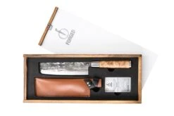 De wortelhouten handgreep oogt zeer luxe en is mooi afgewerkt. Het mes wordt geleverd in een luxe houten tray, inclusief een lederen messchede, om het mes veilig in op te bergen.