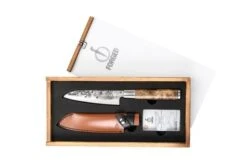 De wortelhouten handgreep oogt zeer luxe en is mooi afgewerkt. Het mes wordt geleverd in een luxe houten tray, inclusief een lederen messchede, om het mes veilig in op te bergen.